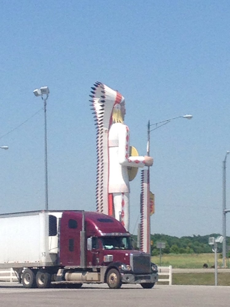 Only one picture today. You may have seen this before as we were here sometime back. It’s the big Indian that greets you as you come into the Woodshed Travel Center at the Big Cabin exit on I-44 in Oklahoma. It’s a nice place with lots of parking, a decent restaurant, inexpensive laundry, showers and a fairly large driver’s lounge with a big screen tv.