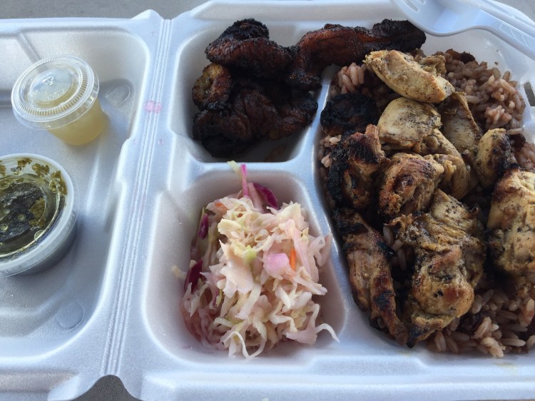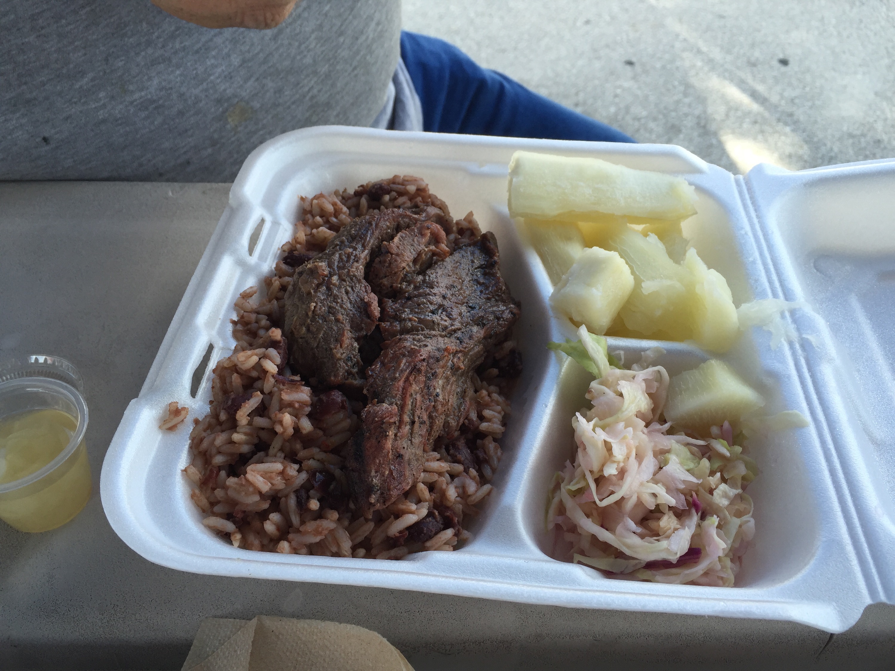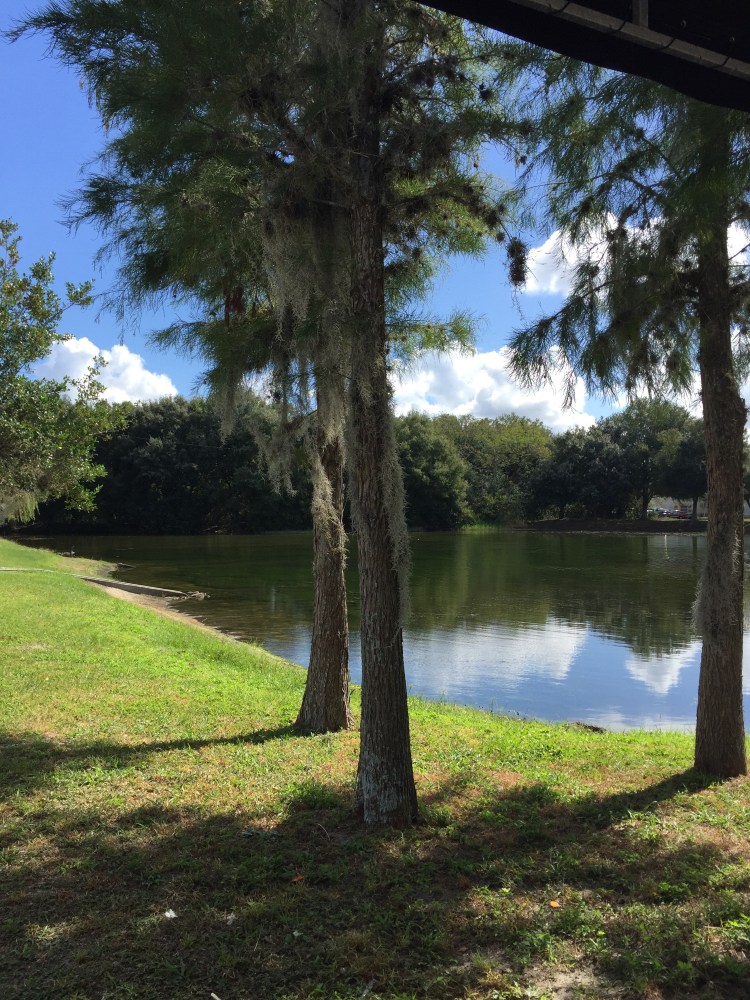 Annie – we had Nicaraguan food for lunch from a food truck. It was delicious. I had chicken and Greg had beef. They came with beans and rice. I also had plaintains and Greg had Yuca. They came with two sauces. One was an herby parsley spice blend with olive oil and the other was a habanero sauce. Yummy! We are at the picnic tables by the lake. There is a blue heron on the left side of the lake but he’s hard to see in the picture. It was a nice place to have lunch except for the heat. It’s still too hot for me and it’s November!