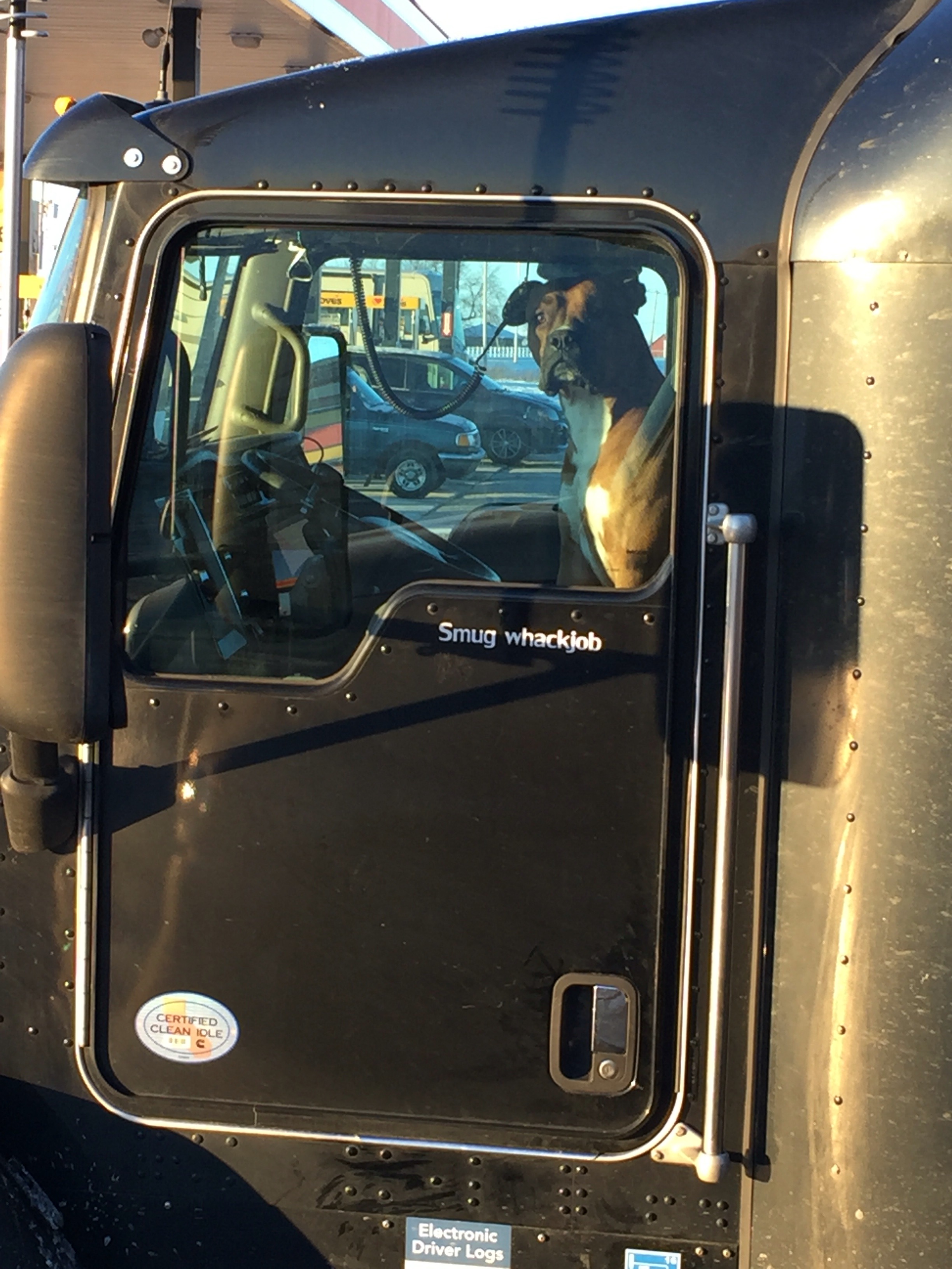 This is him when we went in the truck stop. Of course it is only 14 degrees.