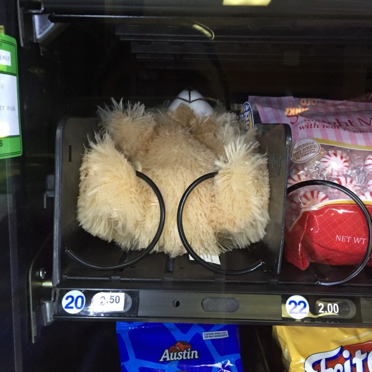 For those of you who forget that last minute gift or need a make up gift on the way home – good news. You can now buy your loved on a teddy bear out of the vending machine at the rest area. Seriously!