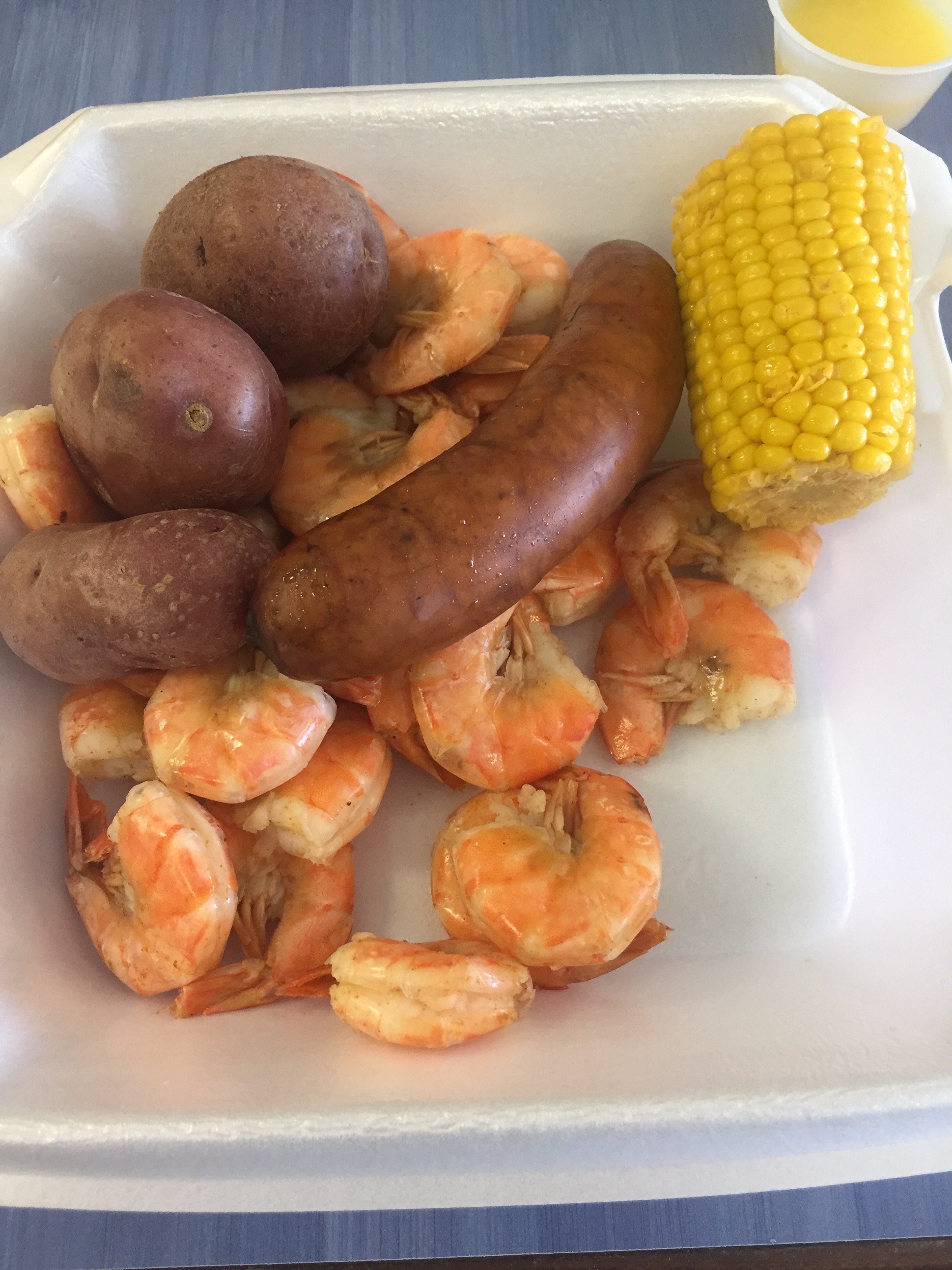 I had the shrimp dinner plate. I think he said that was 2/3 pound of shrimp, boiled new potatoes, boudin sausage and corn on the cob.
